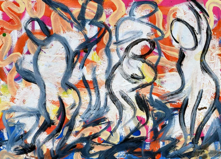 Painting in the figurative expressionist style, the artist’s work is a great reflection of her creative process; simultaneously instinctive and energetic as Legg literally will dance from painting to painting, using varied brush strokes, layers, and textures to build her expressive compositions.
