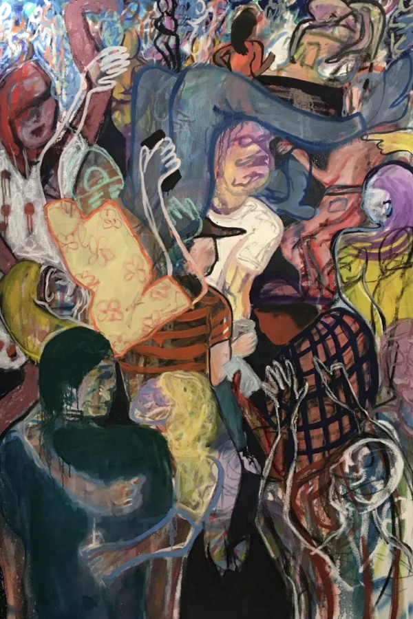 Legg’s figural forms crave social attention, whether this is an intimate embrace amidst a sea of people, or a solo crowd surfer making fleeting connections with the strangers supporting her. An astute observer, the artist looks to her immediate surroundings for inspiration. She is constantly people watching and taking time to notice details. From a quick selfie to the eye-catching pattern from a garment, Legg aims to capture these details within the pictorial field to explore the unique aspects that make up the conglomerate.